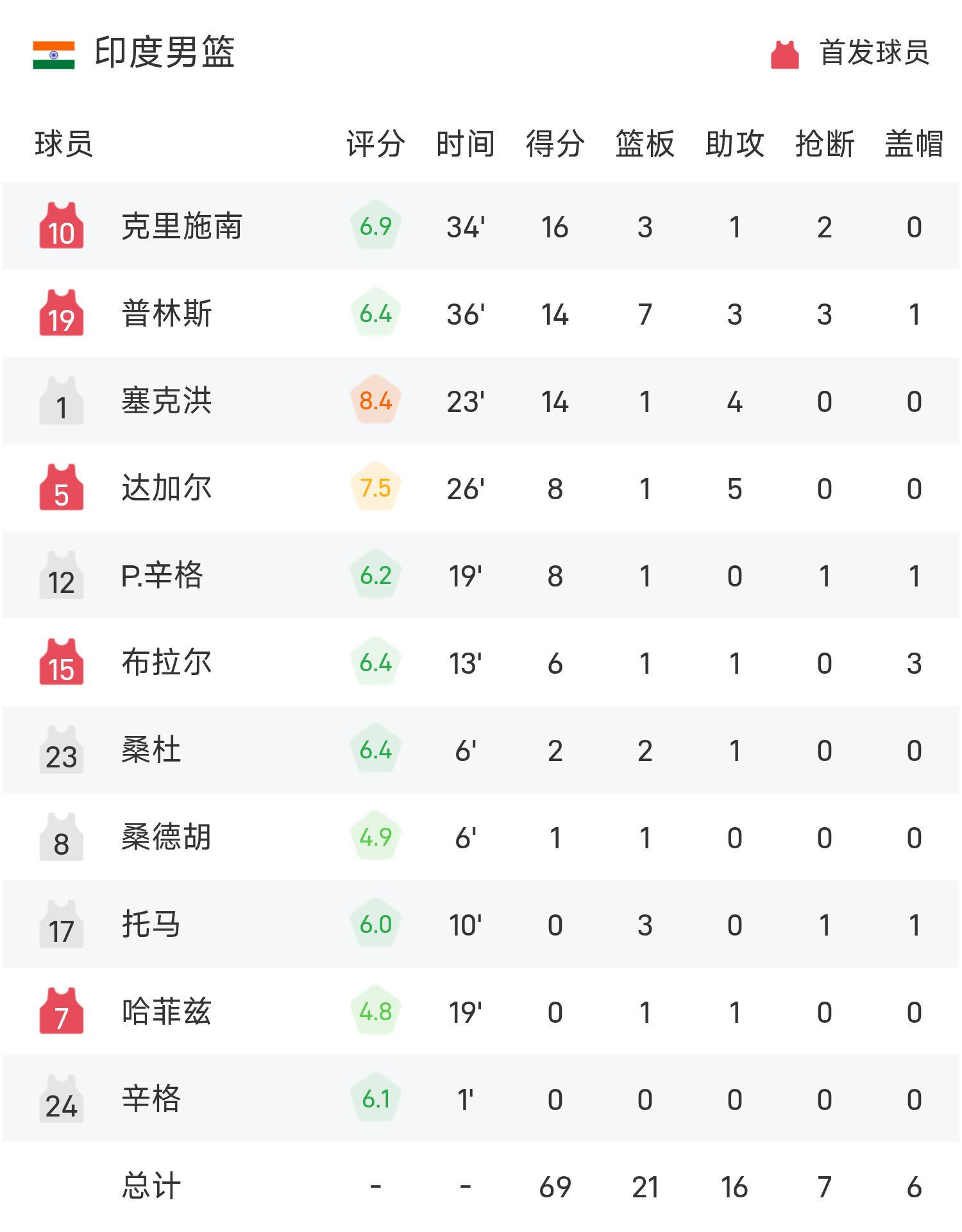 08月07日讯 25赛季男篮亚洲杯 小组赛,印度男篮对阵中国男篮。双方全场战罢,印度男篮69-100不敌中国男篮。胡明轩砍下全场最高的17分1板2助,率领中国男篮成功取胜。