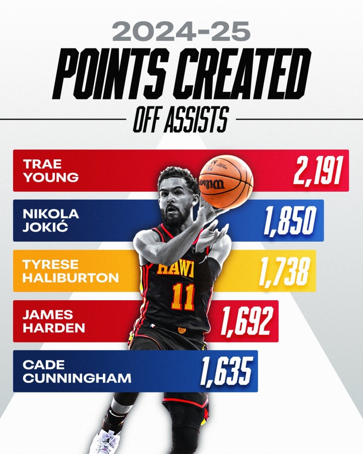 2024-25赛季通过助攻创造得分排名前五的球员: